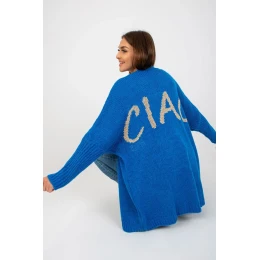 Kardigan s dlouhými širokými rukávy, rozepnutý. Kontrastní nápisy na zadní straně.