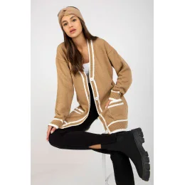 Svetr s dlouhými rukávy, zapínání na knoflíky, boční kapsy. Svetr s kontrastními lemy.