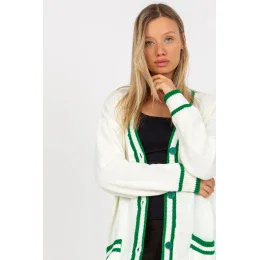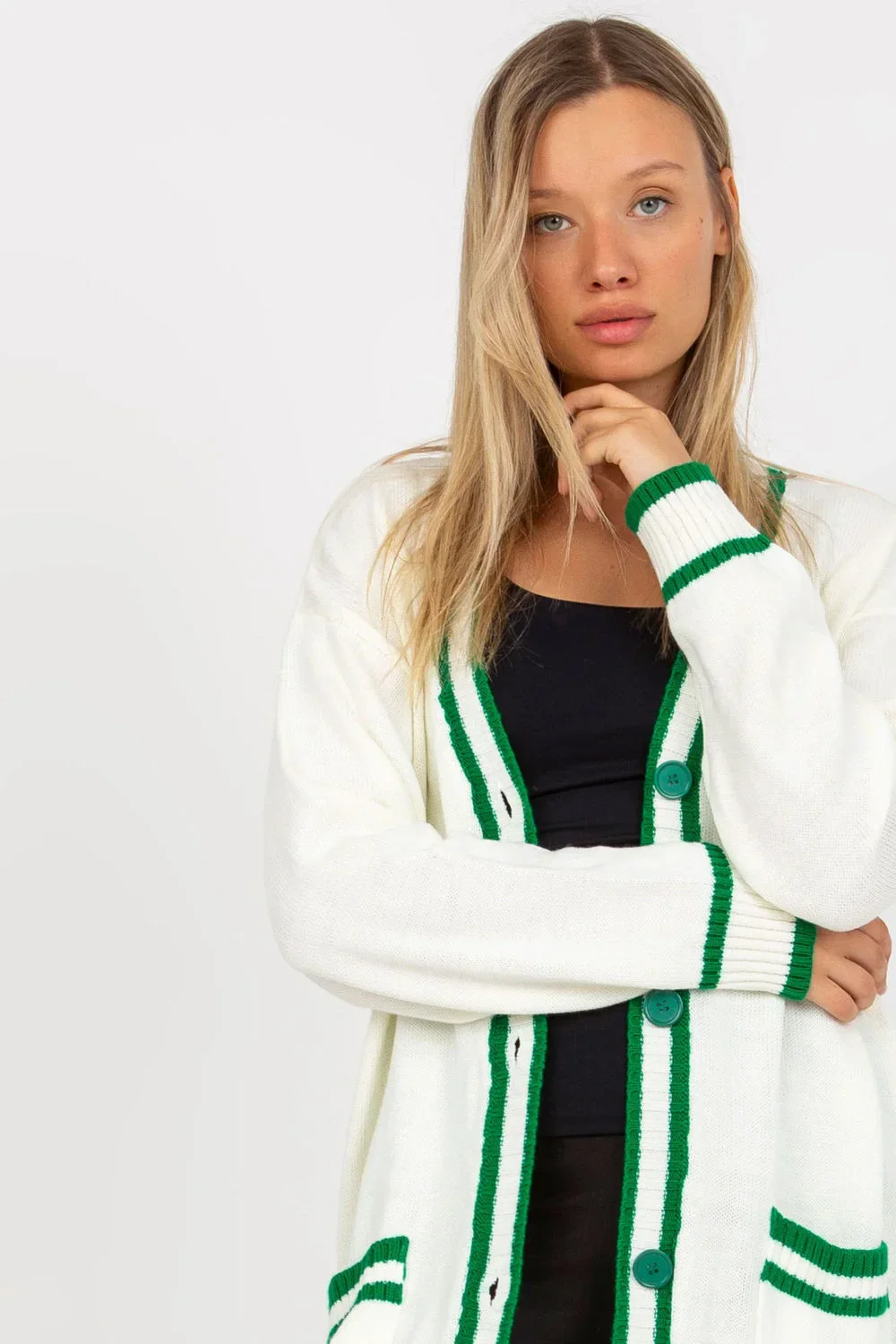 Svetr s dlouhými rukávy, zapínání na knoflíky, boční kapsy. Svetr s kontrastními lemy.