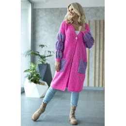 Svetr s dlouhými rukávy a zapínáním na jeden knoflík. Svetr je měkký a nadýchaný na dotek. Kapsy na bocích.