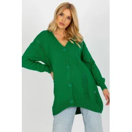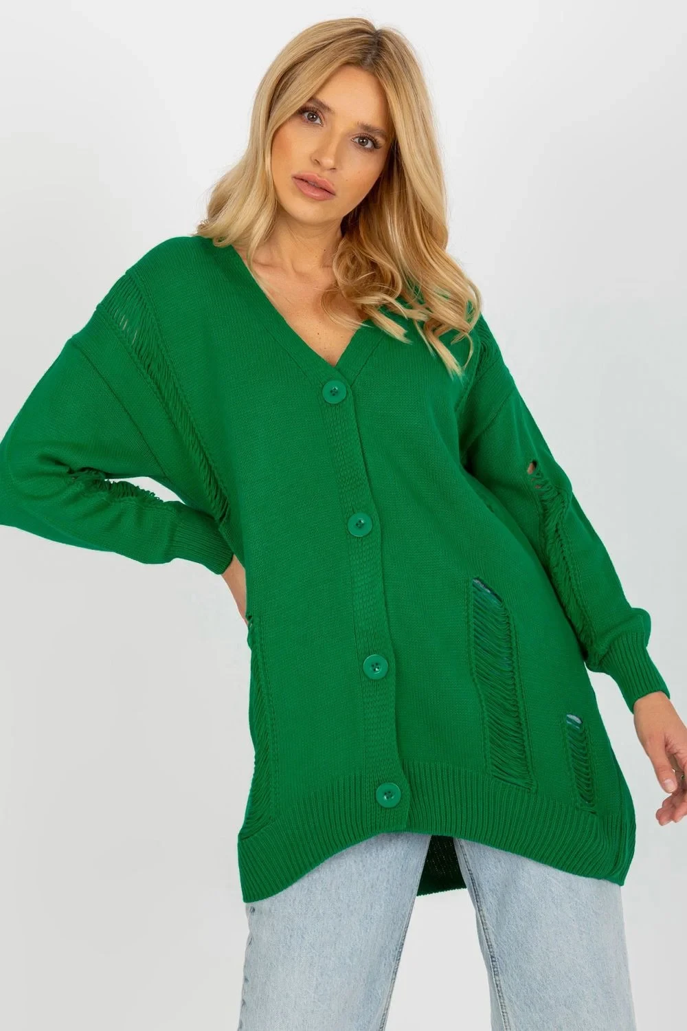 Kardigan s dlouhými rukávy a knoflíky. Svetr se srdíčkovým výstřihem a ozdobnými otvory.