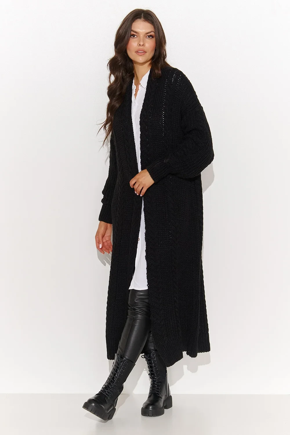 Tento dlouhý dámský svetr je naprostou nezbytností pro chladnější dny. Jeho otevřený střih a široké rukávy zakončené žebrovanými manžetami zajišťují pohodlí a volnost pohybu. Jemná kostkovaná vazba mu dodává na půvabu a jedinečnosti, takže je ideální volbou pro ženy, které ocení originální a elegantní detaily. Nepochybně se stane vaším oblíbeným kouskem šatníku během chladnějších dnů. Svetr se dodává v několika atraktivních barvách: cappuccino, černá, medová, nude a ocelová. Oblečte si ho k džínám a kozačkám a získejte ležérní, ale stylový každodenní vzhled. Nebo ho kombinujte s elegantními kalhotami a jehlovými podpatky pro formálnější příležitosti. Ať už ji budete nosit jakkoli, určitě si ji zamilujete!