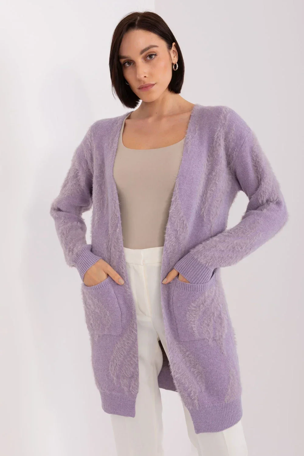 Tento svetr s přehozem je dokonalým kouskem do šatníku pro každodenní nošení. Je vyroben z pestré tkaniny, je pohodlný a módní. Dlouhý rukáv a délka sahající přes boky zajišťují teplo a pohodlí. Je to ideální kousek, který přes sebe můžete přehodit v chladnějších dnech nebo večer. Kardigan nemá zapínání, což mu dodává na ležérnosti a volnosti při nošení. Praktickým prvkem jsou navíc nakládané kapsy, do kterých si můžete uložit drobnosti nebo zahřát ruce. Je to pohodlná a módní volba, která doplní mnoho každodenních vzhledů.