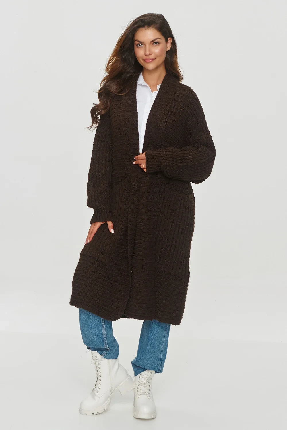 Dlouhý dámský svetr oversize je ideální pro ženy, které ocení pohodlí. Svetr sahá pod kolena, což mu dodává lehce elegantní charakter. Svetr má široké, dlouhé rukávy s žebrovanými manžetami, které umožňují nastavení délky. Materiál je příjemný, s výraznou žebrovanou vazbou, která zdůrazňuje jeho měkkost a hřejivost. Svetr nemá zapínání, což zvyšuje jeho ležérnost, stejně jako široké kapsy na bocích, které jsou praktické a stylové. Takový svetr se skvěle hodí do chladnějších dnů a je ideálním základem pro pohodlný a stylový vzhled, ať už do práce, nebo do společnosti s přáteli.
