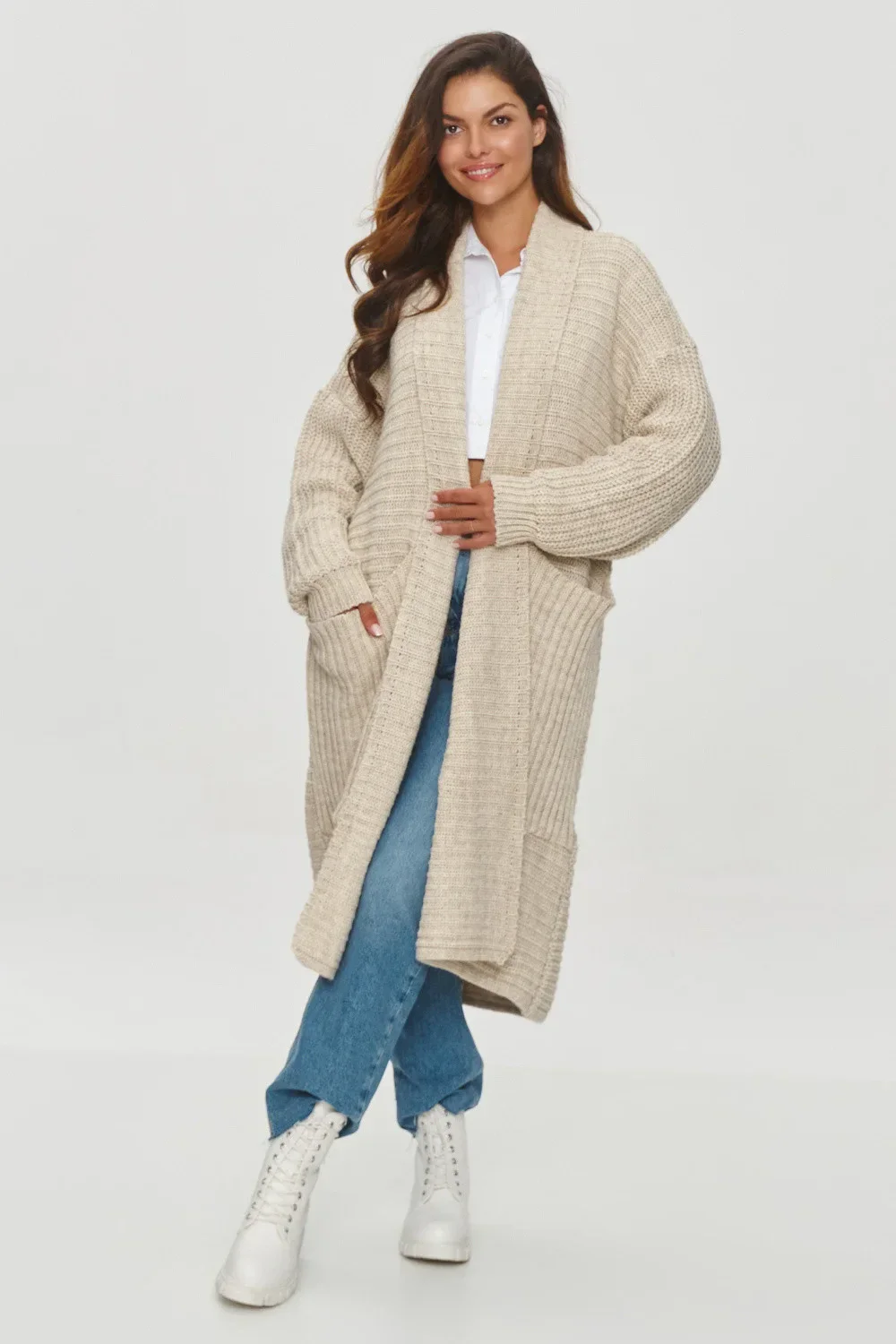 Dlouhý dámský svetr oversize je ideální pro ženy, které ocení pohodlí. Svetr sahá pod kolena, což mu dodává lehce elegantní charakter. Svetr má široké, dlouhé rukávy s žebrovanými manžetami, které umožňují nastavení délky. Materiál je příjemný, s výraznou žebrovanou vazbou, která zdůrazňuje jeho měkkost a hřejivost. Svetr nemá zapínání, což zvyšuje jeho ležérnost, stejně jako široké kapsy na bocích, které jsou praktické a stylové. Takový svetr se skvěle hodí do chladnějších dnů a je ideálním základem pro pohodlný a stylový vzhled, ať už do práce, nebo do společnosti s přáteli.