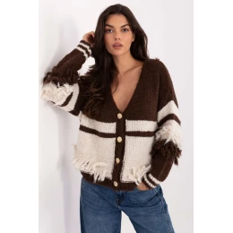 Dvoubarevný dámský svetr je módním prvkem šatníku ve stylu casual, ideální na každodenní vycházky a různé příležitosti. Vyrobený z směsi polyakrylu, polyamidu, vlny a viskózy, poskytuje teplo, pohodlí a potěšení z nošení. Výstřih do šílenosti a zapínání ozdobnými knoflíky mu dodávají elegantní charakter. Dlouhý rukáv a standardní délka zaručují pohodlí nošení. Fristle na přední straně a na rukávech přinášejí originální, lehce bohémský akcent a dodávají svetru jedinečný styl. Jedná se o svetr, který spojuje komfort, funkčnost a módní design, ideální do casualových a stylových kombinací.