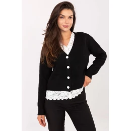 Elegantní a zároveň casual dámský svetr standardní délky, který se skvěle hodí jak do každodenního nošení, tak i do práce. Vyrobený z kombinace polyesteru, vlny a akrylu, poskytuje pohodlí, měkkost a odolnost. Model vyniká hladkým vzorem a decentním lemováním z krajky, jemné ozdoby se objevují u výstřihu do V a na spodku svetra, dodávají celku ženský charakter. Dlouhý rukáv a klasické zapínání na knoflíky dělají ze svetra praktický a univerzální kousek do šatníku. Ideální volba pro ženy, které oceňují spojení pohodlí a elegance v každodenních outfitech.
