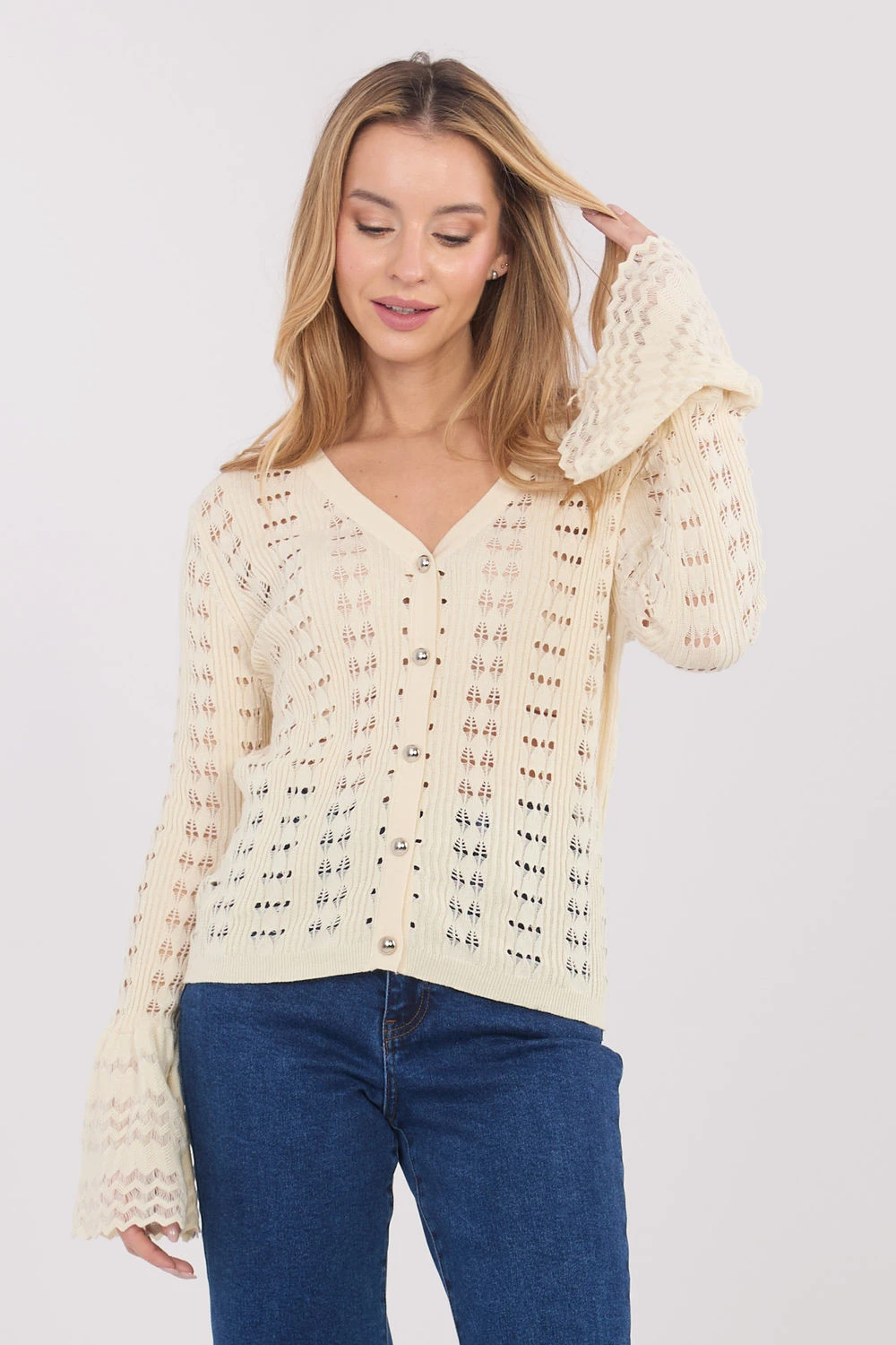 Stylový dámský svetr v boho stylu, ideální pro každodenní outfit. Model se vyznačuje efektním ažurovým vzorem, který dodává celku lehkost, jemnost a módní, umělecký charakter. Svetr je vyroben z kombinace polyesteru a viskózy, díky čemuž je měkký, příjemný na dotek a pohodlný na nošení. Standardní délka z něj činí univerzální střih, který lze snadno sladit s různými kousky oblečení. Dlouhé zvonové rukávy zdůrazňují boho atmosféru a dodávají celku volnou eleganci. Model má výstřih do lodička, který opticky zúží postavu, a zapínání na knoflíky, které umožňuje nosit svetr jak rozepnutý, tak zapnutý. Skvělá volba pro ženy, které ocení pohodlí, přirozený styl a originální detaily v každodenních outfitech.