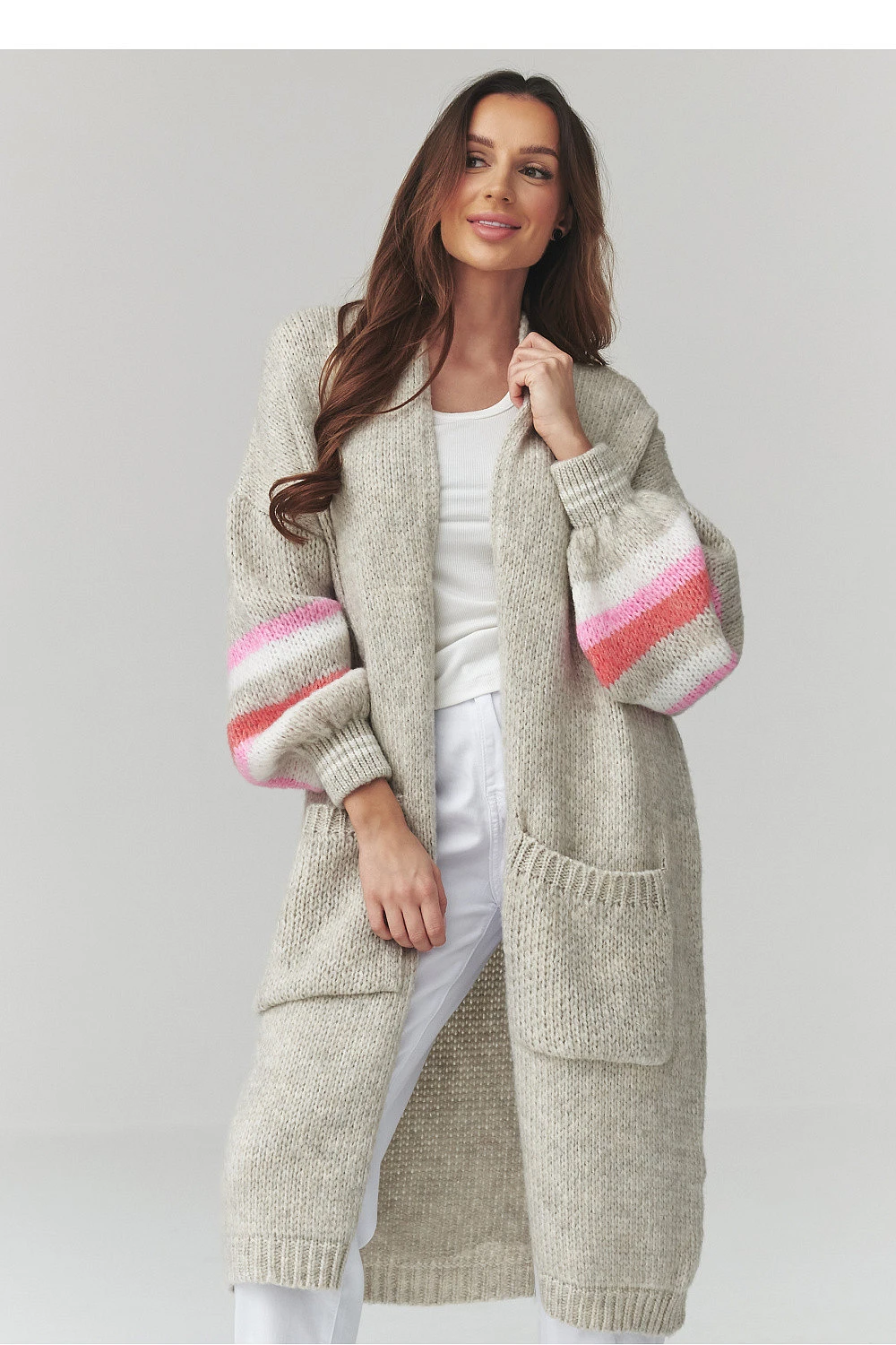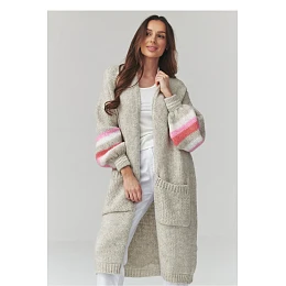 Dlouhý dámský svetr je ideální volbou pro ženy, které ocení pohodlí a styl ve svých každodenních outfitách. Model ve formě kardiganu se vyznačuje volným střihem a příjemným materiálem, díky čemuž poskytuje pohodlí po celý den. Oversize svetr skvěle padne na postavě a umožňuje vytvářet moderní vrstvené kombinace. Praktický kardigan s kapsami spojuje funkcionalitu s módním designem. Velké kapsy mu dodávají charakter a delší střih zase zajišťuje, že dlouhý dámský kardigan skvěle ladí jak s kalhotami, tak s legíny nebo šaty. Ozdobný vzor a stylové zakončení rukávů mu dodávají výjimečný vzhled. Univerzální dámský svetr na každý den se hodí do mnoha outfitů, od každodenního až po elegantní.