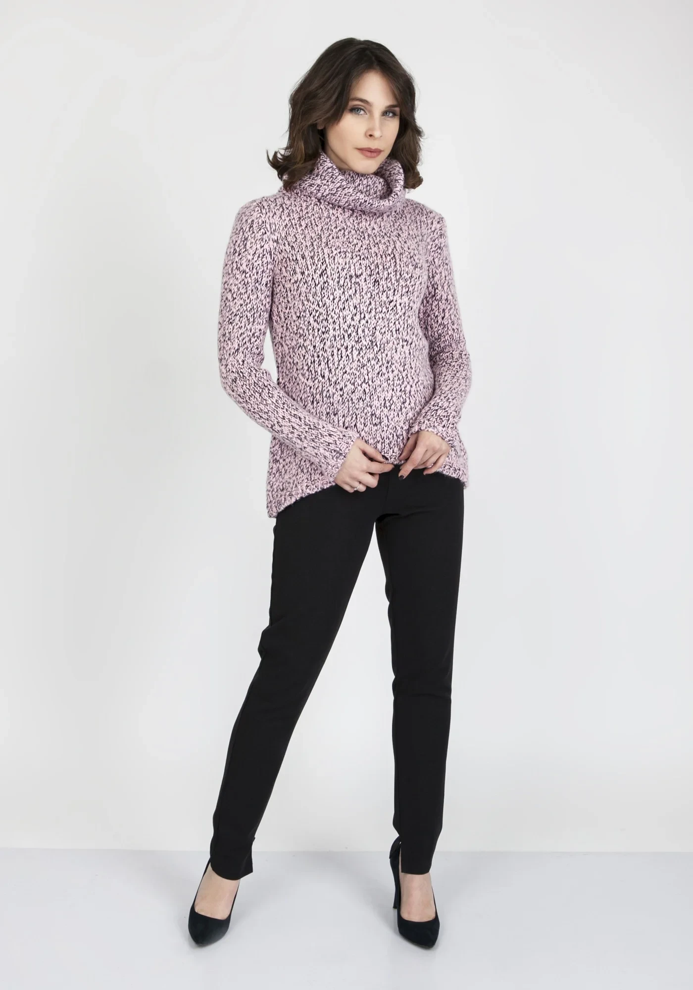 Mimořádně zajímavý svetr s rolákem, vyrobený z měkké, na dotek příjemné příze. Dvoubarevná příze dodává lehce melanžový efekt. Rovný střih, pohodlný, vpředu polopřiléhavý, vzadu klasická rovná linie. Výrobek polské značky MKM. Složení: 80% akryl, 10% vlna, 10% polyamid.