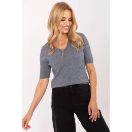 Volný dámský svetr vyrobený z elastické směsi viskózy, polyesteru a polyamidu, který poskytuje pohodlí a lehkost nošení. Výstřih do V dodává siluetě jemnou eleganci a krátký rukáv dělá svetr ideálním pro každodenní stylizace a do práce. Různorodá textura materiálu dodává celku zajímavý charakter a standardní délka umožňuje snadné kombinování svetru s různými kalhotami a sukněmi. Bez zapínání, jednoduchý a univerzální model, ideální pro volnočasové a pracovní outfity.