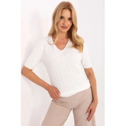 Každodenní dámský svetr vyrobený z elastické směsi viskózy, polyesteru a polyamidu, který poskytuje pohodlí a lehkost nošení. Výstřih do V dodává siluetě jemnou eleganci a krátký rukáv zase dělá svetr skvělým pro každodenní stylizace a do práce. Různorodá textura materiálu dodává celku zajímavý charakter a standardní délka umožňuje snadné kombinování svetru s různými kalhotami a sukněmi. Model bez zapínání, jednoduchý a univerzální, ideální pro každodenní a pracovní outfit.