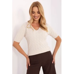 Bezstarostný dámsky sveter vyrobený z elastického zmesi viskózy, polyesteru a polyamidu, ktorý zaručuje pohodlie a ľahkosť nosenia. Výstrih v tvare V dodáva postave jemnú eleganciu, krátke rukávy robia z tohto svetra ideálny kúsok do každodenných outfitov aj do práce. Zaujímavá textúra materiálu pridáva celku zaujímavý charakter a štandardná dĺžka umožňuje ľahké kombinovanie so širokou škálou nohavíc a sukien. Bez zipsu, jednoduchý a univerzálny model, ideálny do každodenných a biznisových outfitov.