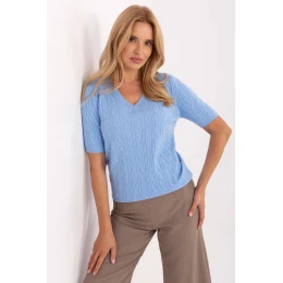 Casual dámský svetr vyrobený z elastické směsi viskózy, polyesteru a polyamidu, který zajistí pohodlí a lehkost nošení. Výstřih do V dodává postavě jemnou eleganci a krátký rukáv zase dělá svetr skvělým v každodenních stylizacích a do práce. Různorodá faktura materiálu dodává celku zajímavý charakter a standardní délka umožňuje snadné kombinování svetru s různými kalhotami a sukněmi. Model bez zapínání, jednoduchý a univerzální, ideální pro casual a business outfit.