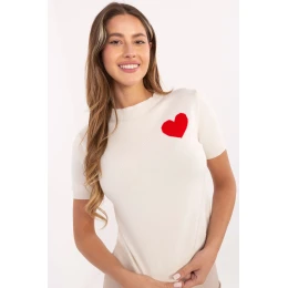 Elegantní a pohodlný dámský svetr ideální na každý den. Vyrobený z příjemné směsi viskózy, polyamidu a PBT, zajišťuje pohodlí nošení a skvělé přizpůsobení postavě. Model s standardní délkou a krátkým rukávem se skvěle hodí jak do každodenních, tak do ženských stylizací. Kulatý výstřih decentně zdůrazňuje krk, a potisk ve tvaru srdce na úrovni prsou dodává celku půvab a dívčí grády. Je to skvělá volba pro ženy, které si cení módního a zároveň pohodlného stylu na každý den.