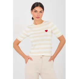 Elegantní pruhovaný dámský svetr je ideální volbou pro ženy, které ocení pohodlí a módní, casualový styl. Klasický pruhovaný design mu dodává nadčasový charakter a skvěle zapadá do každodenních outfitů. Model s standardní délkou se skvěle přizpůsobí postavě, zatímco krátký rukáv zajišťuje pohodlí, zejména v teplejších dnech nebo jako součást vrstvených outfitů. Kulatý výstřih zdůrazňuje univerzální charakter svetra a dělá ho vhodným jak k džínům, tak k sukním nebo elegantním kalhotám. Svetr je vyroben z kvalitní směsi viskózy a polyesteru, díky čemuž je materiál měkký, příjemný na dotek a odolný proti mačkání. Okouzlujícím detailem je vyšitý srdíčkový motiv na úrovni hrudi vlevo, který celkovému vzhledu dodává decentní, ženský charakter. Jedná se o skvělou volbu na každý den do práce, na setkání s přáteli nebo pro procházky.