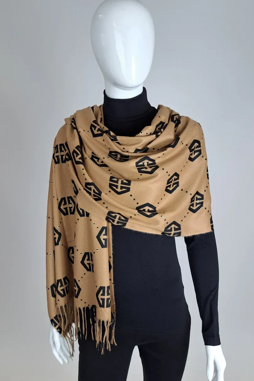 Krásný velký šátek v módním potisku se zlatými prvky. Model je ideální pro kabáty i jiné styly. Mimořádně měkká a na dotek příjemná tkanina.