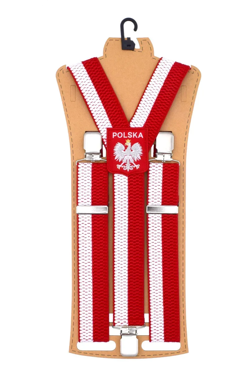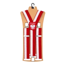 Bílé a červené šle pro fanoušky. Na zadní straně vypleten znak Polska. Módní a praktická pomůcka pro fanoušky. Šířka gumy: 4 cm, složení: 76 % polyester, 24 % elastodin