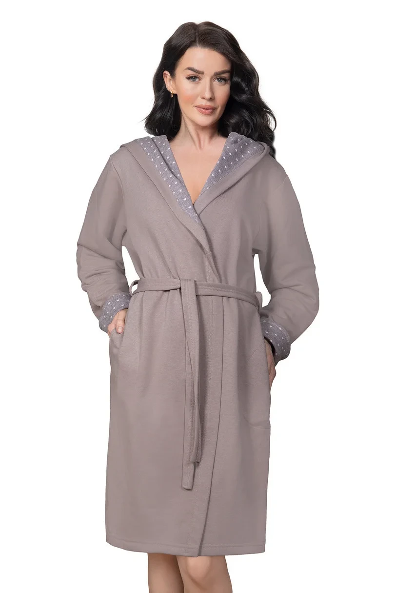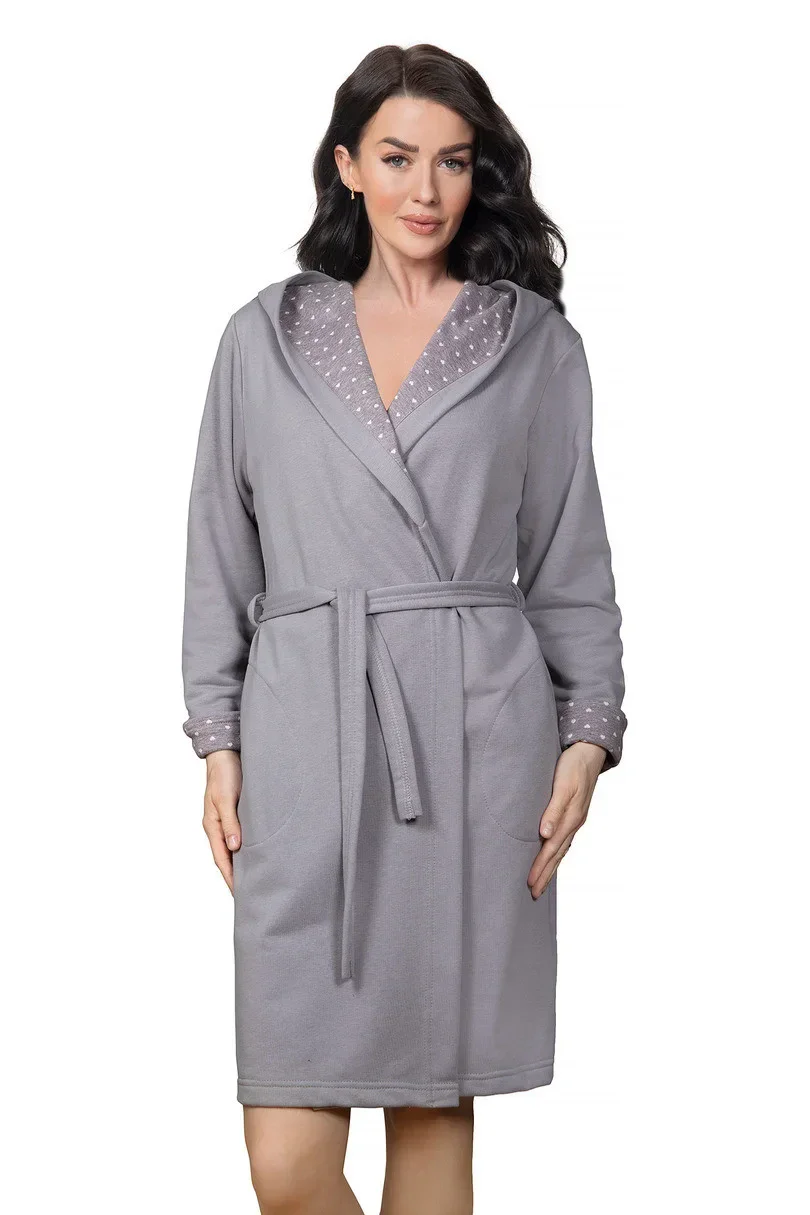 Elegantní dámský župan s vázáním, vyrobený z bavlněného úpletu, k dostání ve dvou barvách. Župan s kapucí. Manžety a kapuce zdobené vzorovanou látkou.