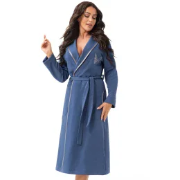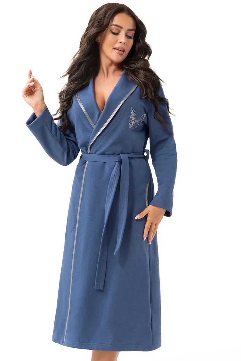 Elegantní dámský župan z bavlněného úpletu. šálový límec s dlouhými rukávy, zavazování v pase. kapsy na úrovni boků.
