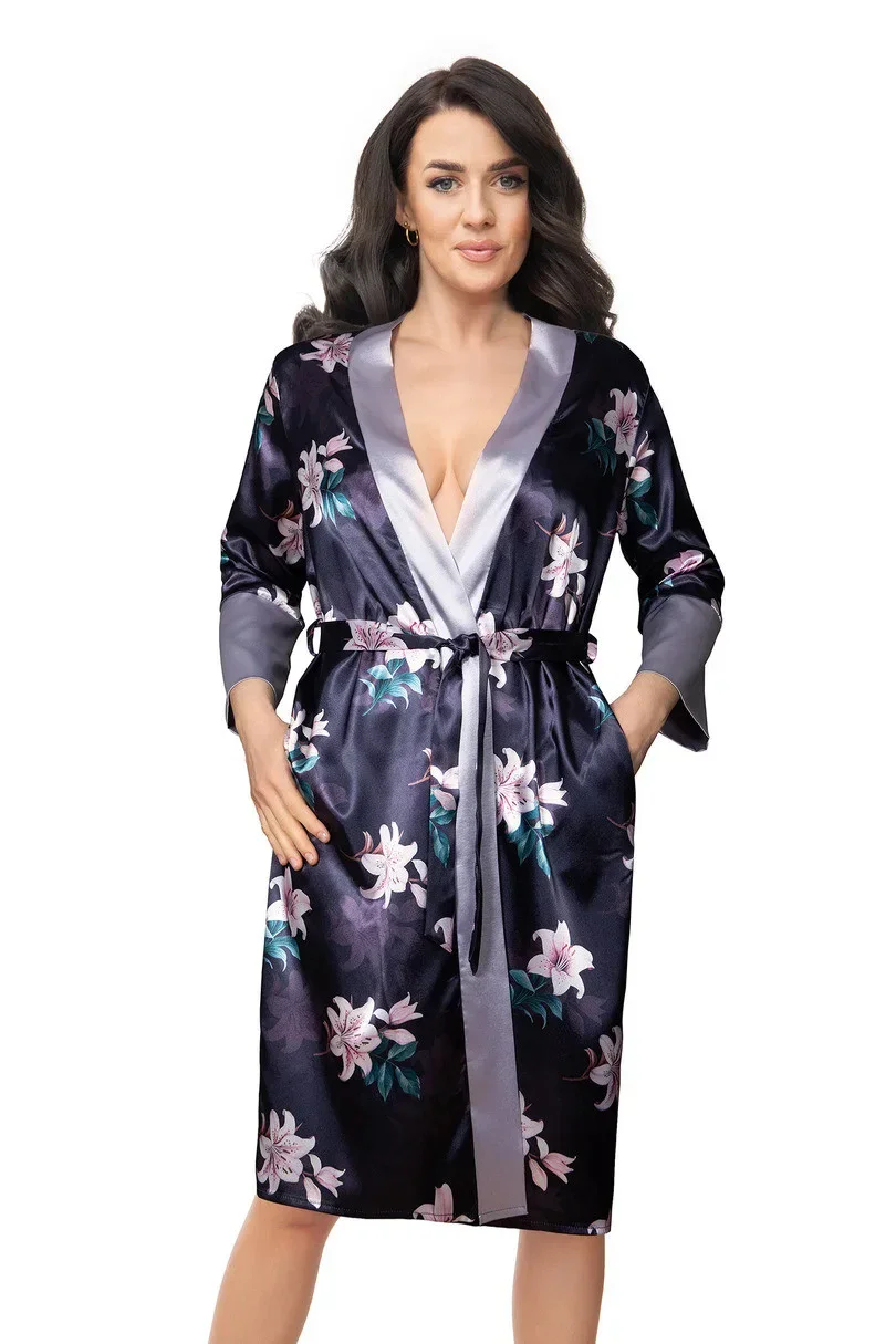 Dámský saténový župan s rukávy v délce 7/8, zavazování v pase, kapsy na úrovni boků.