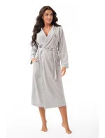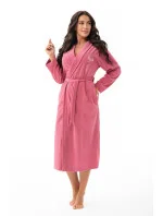 Pohodlný a pohodlný dlouhý dámský župan s límečkem, vyrobený z měkkého úpletu, se stahovací šňůrkou v pase, bočními kapsami a květinovou výšivkou na hrudi.