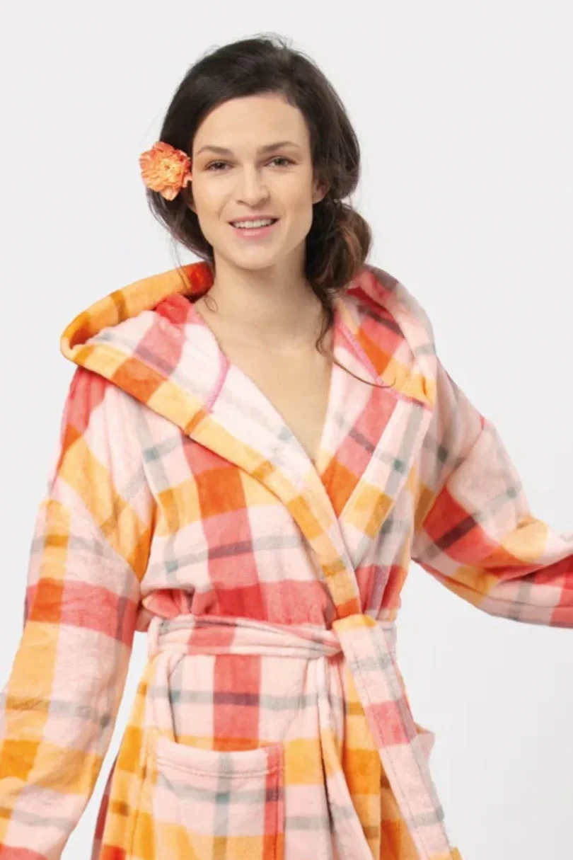 ženský, klasický střih podtrhuje výjimečně hedvábný a měkký úplet Velvet Super Soft, který zajišťuje odolnost a pohodlí při nošení. Prostorný, lehký kostkovaný komplet ve veselých podzimních barvách broskvové a béžové rozzáří všechny večery a rána. Celý komplet doplňují hluboké přední kapsy a pohodlná volná kapuce. Je ideální po koupeli nebo při vrstvení přes pyžamo.