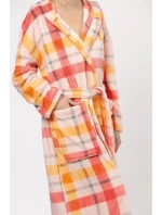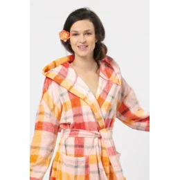Kobiecy, klasyczny krój podkreśla wyjątkowo jedwabista i miękka dzianina typu Velvet Super Soft, która zapewnia trwałość i komfort noszenia. Przestrzenna, lekka krata w radosnych, jesiennych kolorach brzoskwini i beżu rozjaśni wszystkie wieczory i poranki. Całość dopełniają głębokie przednie kieszenie i wygodny swobodny kaptur. Idealnie sprawdzi się po kąpieli lub narzucony na piżamkę.