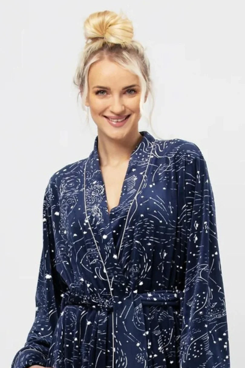 Krátký dámský župan s hvězdnou oblohou - na dotek mimořádně příjemný ženský župan v délce ke kolenům. Je vyroben z mírně elastického úpletu s elastanem, který obepíná tělo a zdůrazňuje přednosti ženské siluety. Jeho střih neomezuje v pohybu, je pohodlný a zároveň velmi praktický - má hluboké boční kapsy a široký pásek. Všité manžety ve spodní části rukávů lze rychle a snadno ohrnout - aby nepřekážely při vaření ranní kávy! Velmi ženský župan, plný šarmu a elegance - ideální pro chvíle odpočinku a radosti doma!