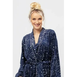 Krótki szlafrok damski z rysunkiem rozgwieżdżonego nieba. Niezwykle przyjemna w dotyku kobieca podomka/ szlafrok przed kolano Wykonany z lekko rozciągliwej dzianiny z dodatkiem elastanu, która otula ciało i podkreśla atuty kobiecej sylwetki. Krój nie ogranicza ruchów, jest wygodny, a przy tym bardzo praktyczny - posiada boczne głębokie kieszenie i szeroki pas. Doszywane mankiety w dole rękawa można szybko i łatwo podwinąć - tak, aby nie przeszkadzały przy parzeniu porannej kawy! Bardzo kobiecy szlafrok, pełen uroku i elegancji - doskonały na chwile relaksu i radości w domu!