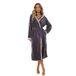 Dlouhý dámský župan z hřejivého měkkého úpletu s kapucí. Kapsy na bocích, zavazování v pase. Ozdobná výšivka na hrudi.