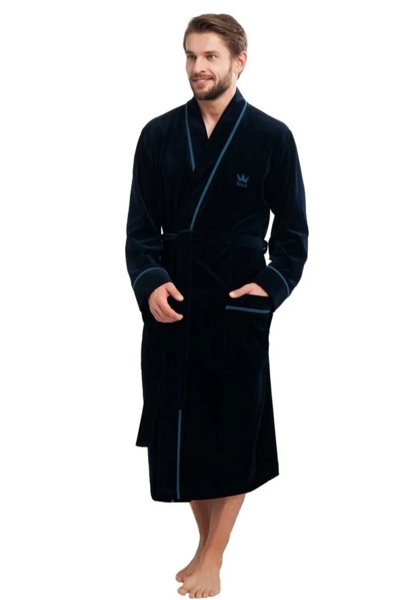 Klasický velurový pánský župan. Příjemný, měkký látkový šálový límec lemovaný lemováním v kontrastní barvě. Ozdobná výšivka na hrudi, zavazování v pase, pohodlné kapsy na bocích.