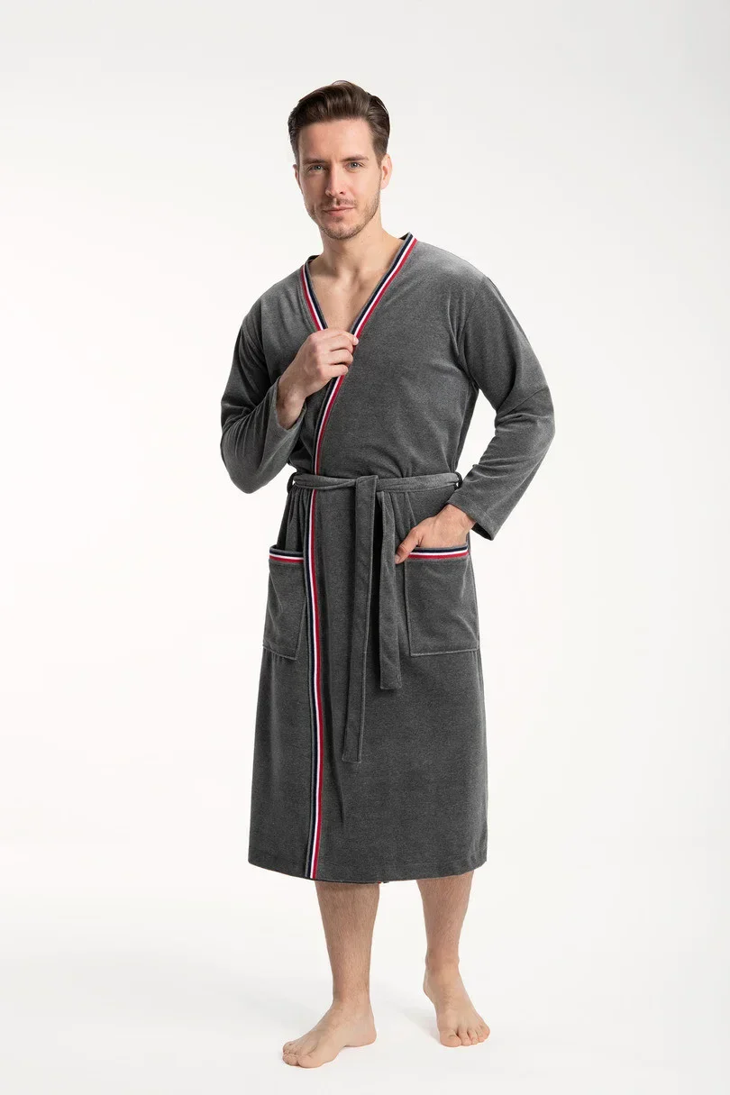 Pánský župan Luna s dlouhými rukávy a barevnými záhyby, zavazování na pásek, s kapsami, délka do půli lýtek.