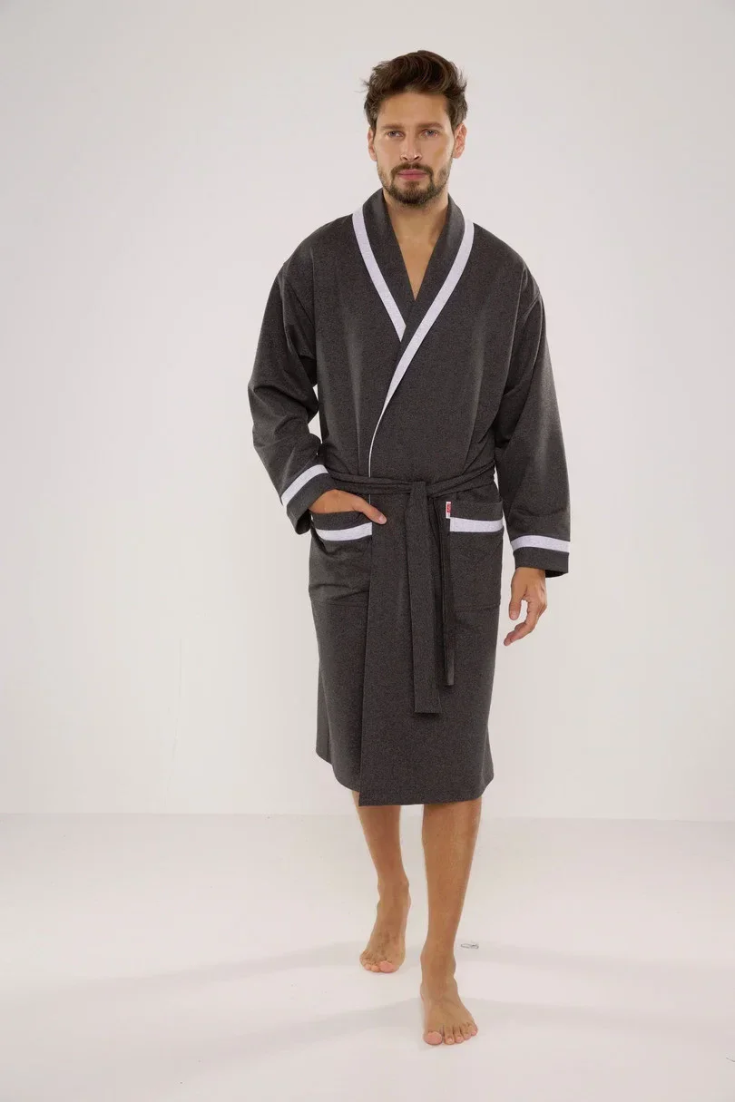 Pánský župan s límečkem, zavazování v pase, kapsy na bocích. Složení: 79 % bavlna, 17 % polyester, 4 % elastan.