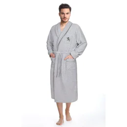 Elegantní pánský froté župan z vysoce kvalitní bavlny s límcem lemovaným lamóm v kontrastní barvě, zavazuje se v pase.