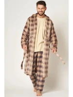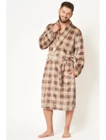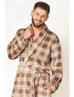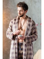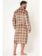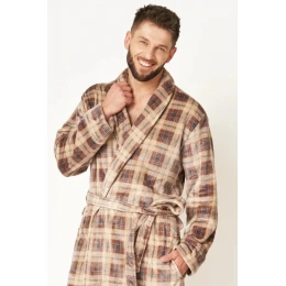 Długi szlafrok męski o klasycznym kroju. Przestrzenna krata w stonowanych kolorach brązu podkreśla jego elegancję i daje efekt 3D. Długość do połowy łydki, boczne kieszenie i wygodny szalowy kołnierz. Przyjemny dla Ciała szlafrok z wyjątkowo lekkiej i miękkiej dzianiny typu FLANNEL FLEECE, która zapewnia trwałość i komfort noszenia. Idealnie sprawdzi się na chłodny jesienno – zimowy czas.