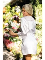 Velmi elegantní župan z kvalitního bílého saténu. Návrh plný jedinečného půvabu, protože rukávy i horní část zad jsou zdobeny charakteristickou jemnou bílou krajkou s motivem růží. Střih se zavazuje v pase pomocí přiloženého pásku. Šaty jsou ideální také jako součást svatebního šatníku. Složení: 100% polyester.