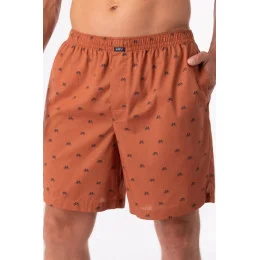 Klasické krátké šortky s kapsami. Světlá kresba jízdního kola na hnědém pozadí. Šortky z mimořádně měkké, vysoce kvalitní 100% bavlněné tkaniny v kombinaci s vhodným prošitím a nití zaručují odolnost a pohodlné používání. Volné pánské šortky s kapsami. Měkký, vnitřní elastický pas. Pohodlný, univerzální střih určený pro každý typ postavy. Zapínání na knoflíky vpředu a hluboké kapsy po stranách.