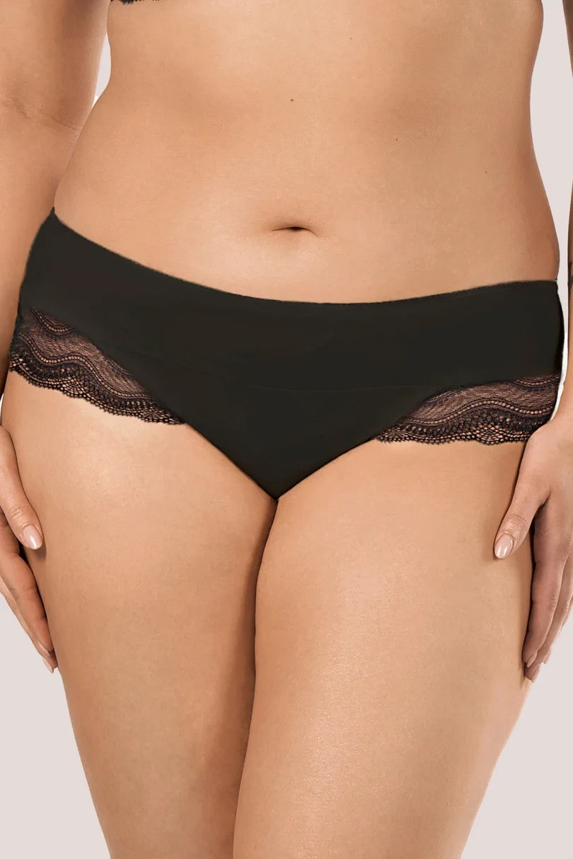 Elegantní šortky Pepite v sytě černé barvě Mefemi by NIPPLEX jsou kombinací klasiky s nádechem smyslnosti. Jemná krajková vsadka se zvlněným vzorem decentně zvýrazňuje ženské tvary a dodává prádlu jedinečný půvab. Jsou vyrobeny z vysoce kvalitních materiálů, které zajišťují pohodlí a dlouhou životnost. Měkký úplet se dokonale přizpůsobí siluetě, aniž by působil tlak. Je ideální volbou pro každodenní nošení i pro zvláštní příležitosti.