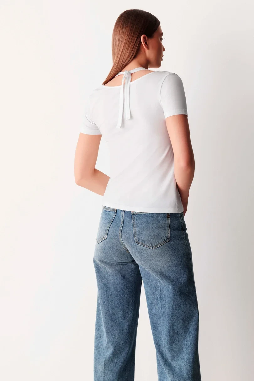 Dámské tričko Cotonella ADC72 je moderní interpretací klasiky. Je vyrobeno ze směsi bavlny a elastanu příjemné na dotek a zaručuje perfektní padnutí a pohodlné nošení. Tričko má krátké rukávy a zajímavě zdobený výstřih s poutavými průstřihy a zavazováním na zádech. Mírně elastická tkanina zvýrazňuje siluetu a díky minimalistickému, ale originálnímu designu se tričko skvěle hodí jak pro každodenní nošení, tak pro ležérnější outfity.