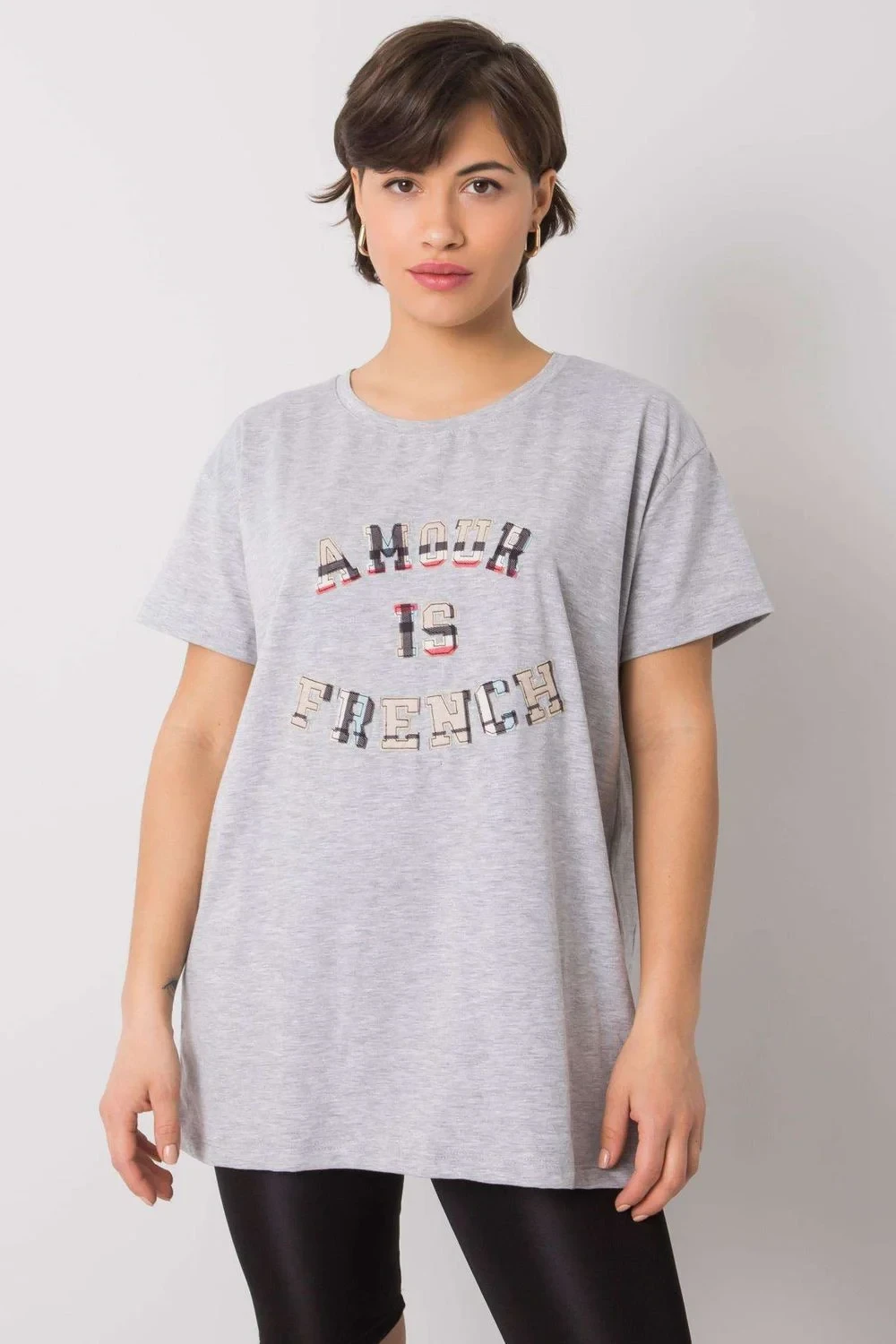 Dámské tričko volnějšího střihu s krátkými rukávy a kulatým výstřihem. Ozdobný nápis na přední straně.