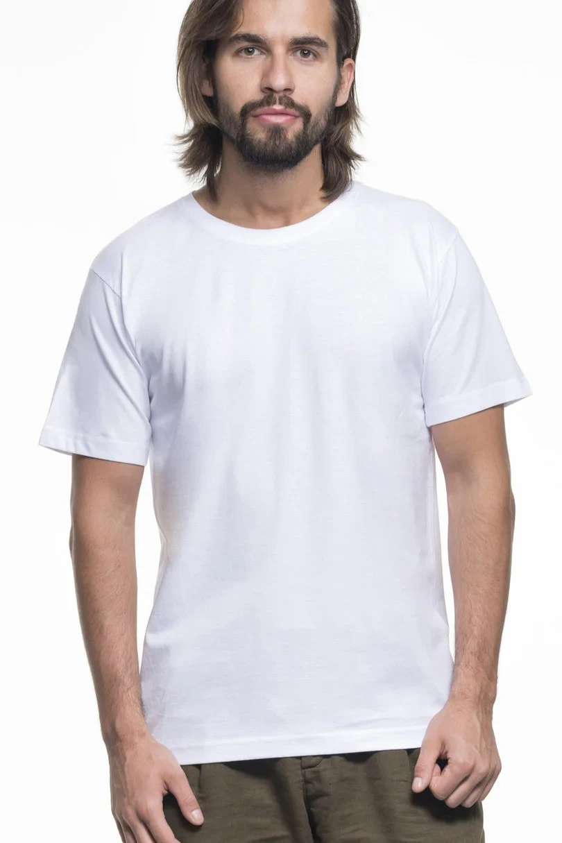 T-shirt męski z krótkim rękawem wykonany z dzianiny single jersey;klasyczny fason; materiał poddany praniu enzymatycznemu, dzięki czemu jest pozbawiony nierówności; wykończenie silikonowe materiału powodujące że jest miękki i miły w dotyku; dekolt wykończony dwuwarstwowym ściągaczem z elastanem zapewniającym dłuższą trwałość; kark i ramiona z taśmą wzmacniającą i stabilizującą, która pozytywnie wpływa na trwałość szwów; boki bezszwowe zapewniające lepszy komfort w noszeniu i dające większe możliwości nadruku; podwójne gęste szwy do których wykorzystano nici najwyższej jakości