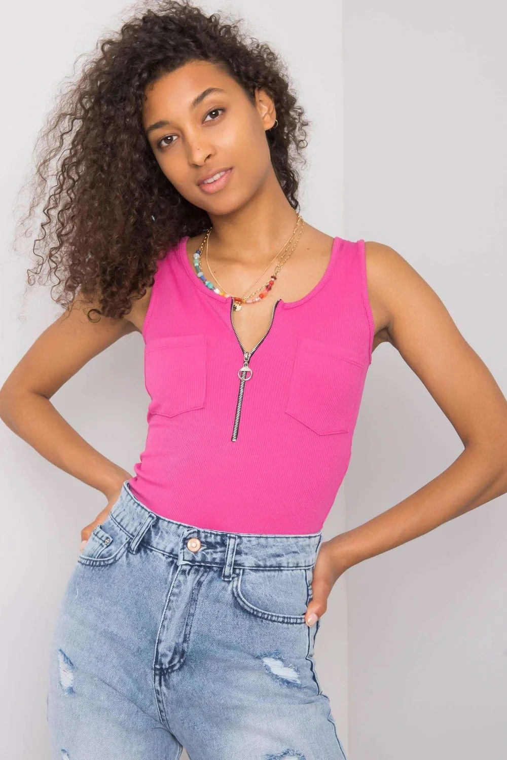Tričko s kulatým výstřihem, ramínka. Zapínání na zip vpředu a ozdobné kapsy. Ideální na léto.