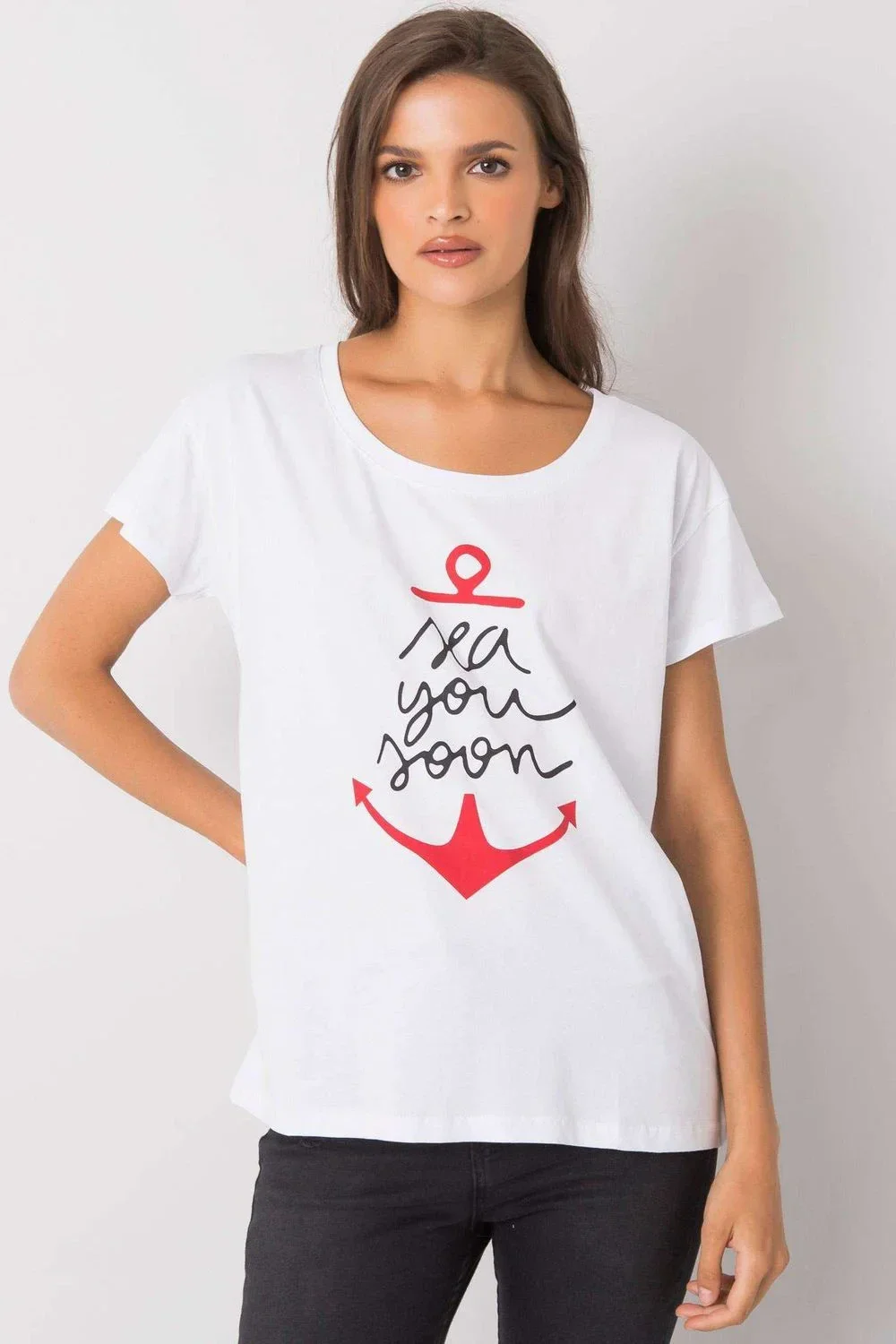 Dámské tričko s krátkými rukávy a kulatým výstřihem, ozdobný potisk na přední straně.