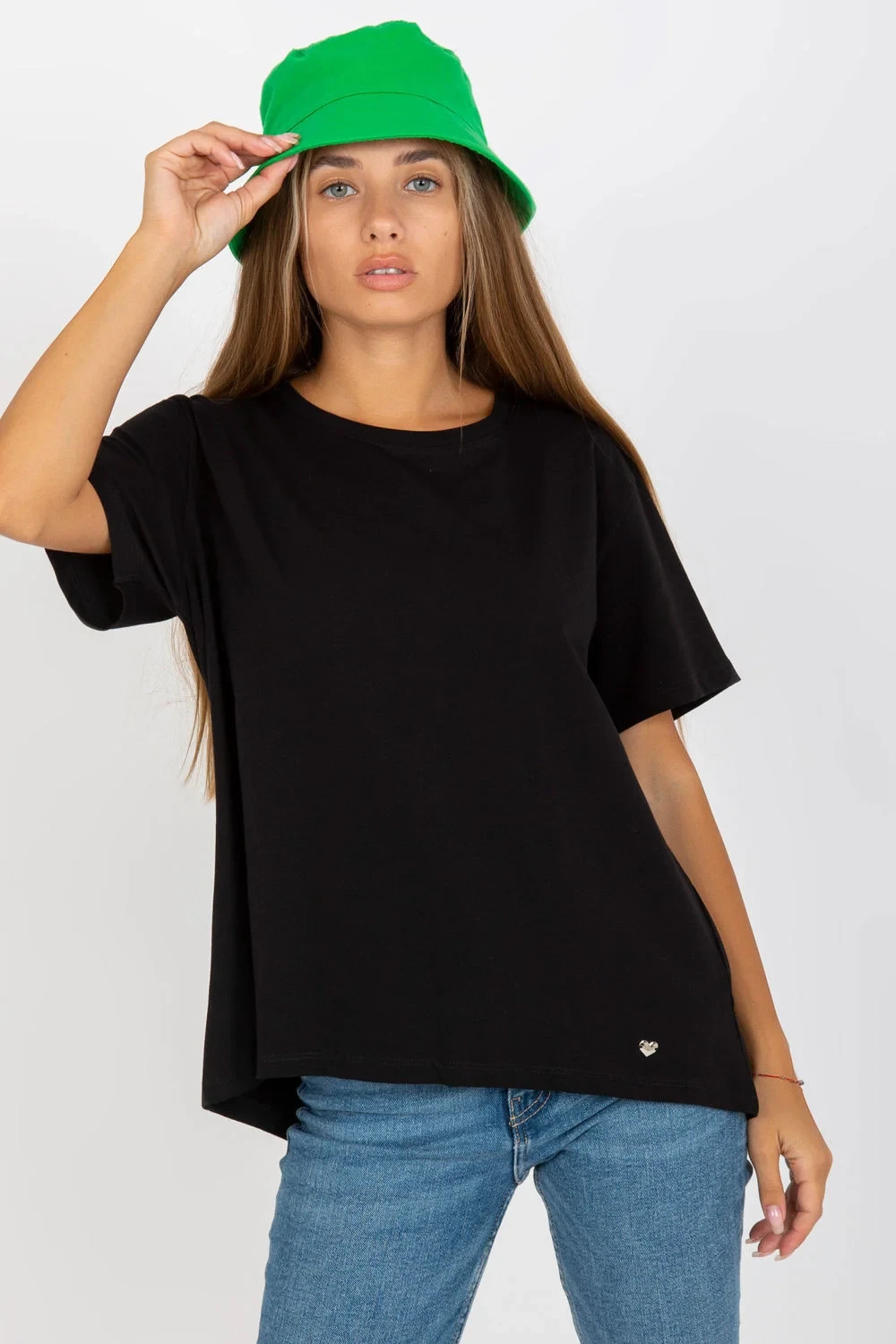 Dámské tričko s krátkým rukávem a kulatým výstřihem. Zadní část trička je mírně rozšířená.