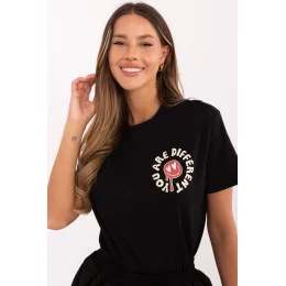 Dámské tričko klasického střihu, vyrobené z vysoce kvalitní bavlny, která poskytuje pohodlí při nošení. Přední část zdobí decentní potisk s nápisem, který dává tričku módní a minimalistický charakter. Zadní část je ozdobena potiskem spojeným s dynamickými nápisy, které dodávají celku originální výraz. Model standardní délky s krátkými rukávy a kulatým výstřihem se skvěle hodí do každodenních stylizací. Ideální volba pro ženy, které si cení pohodlí a stylu v jednom.