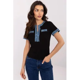 Přizpůsobený dámský top v casual stylu je skvělou volbou na každý den. Vyrobený z měkké bavlny s přídavkem elastanu skvěle padne a poskytuje pohodlí a volnost pohybu. Klasický výstřih do V zdůrazňuje ženský charakter, zatímco krátké rukávy dělají z topu univerzální kousek na každé roční období. Zvláštní akcent tvoří dokončení z džínoviny, které mu dodává originalitu a lehkost. Standardní délka topu ho skvěle doplňuje jak s džínami, tak s sukněmi, vytvářející stylové a pohodlné outfity na každý den.