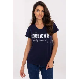 Dámské tričko v casual stylu je ideální volbou pro každodenní outfit s nádechem lesku. Vyrobeno z měkké a elastické směsi bavlny a elastanu, poskytuje pohodlí nošení a skvělé přizpůsobení postavě. Model má standardní délku s krátkým rukávem a ženským výstřihem do šípku. Na přední straně je nápadný potisk s aplikací, zdobený jemnými cirkony, které tričku dodávají výjimečný charakter a jemný lesk. Toto tričko je kombinací pohodlí a stylu, skvělou volbou na každý den, která snadno oživí každý casual outfit.