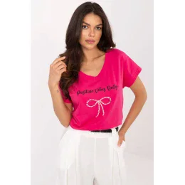 Dámské volnočasové tričko vytvořené s ohledem na každodenní pohodlí a módní vzhled. Ušitý z vysoce kvalitní bavlny s přídavkem elastanu, dokonale se přizpůsobuje postavě a poskytuje pohodlí po celý den. Model standardní délky s krátkým rukávem a klasickým kulatým výstřihem. Tričko je zdobené efektní aplikací a potiskem, a další ozdoby z cyrkonie dodávají celku jemný lesk a elegantní charakter. Ideální návrh pro každodenní volné stylizace, které se vyznačují detaily.