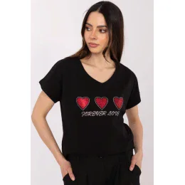 Dámské triko v casual stylu je pohodlnou a stylovou volbou pro každodenní nošení. Vyrobeno z měkké bavlny s přídavkem elastanu, poskytuje pohodlí a volnost pohybu po celý den. Model má standardní délku, krátký rukáv a klasický kulatý výstřih. Na přední straně je dekorativní aplikace ve tvaru srdcí obklopená třpytivými korálky, které tričku dodávají šarm a jemný lesk. Ideální volba pro ženy, které ocení pohodlí s nádechem romantického stylu.